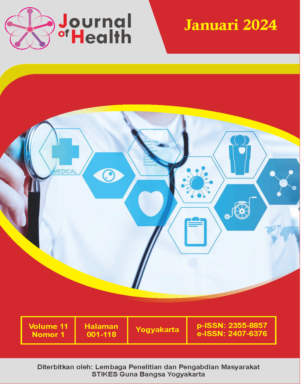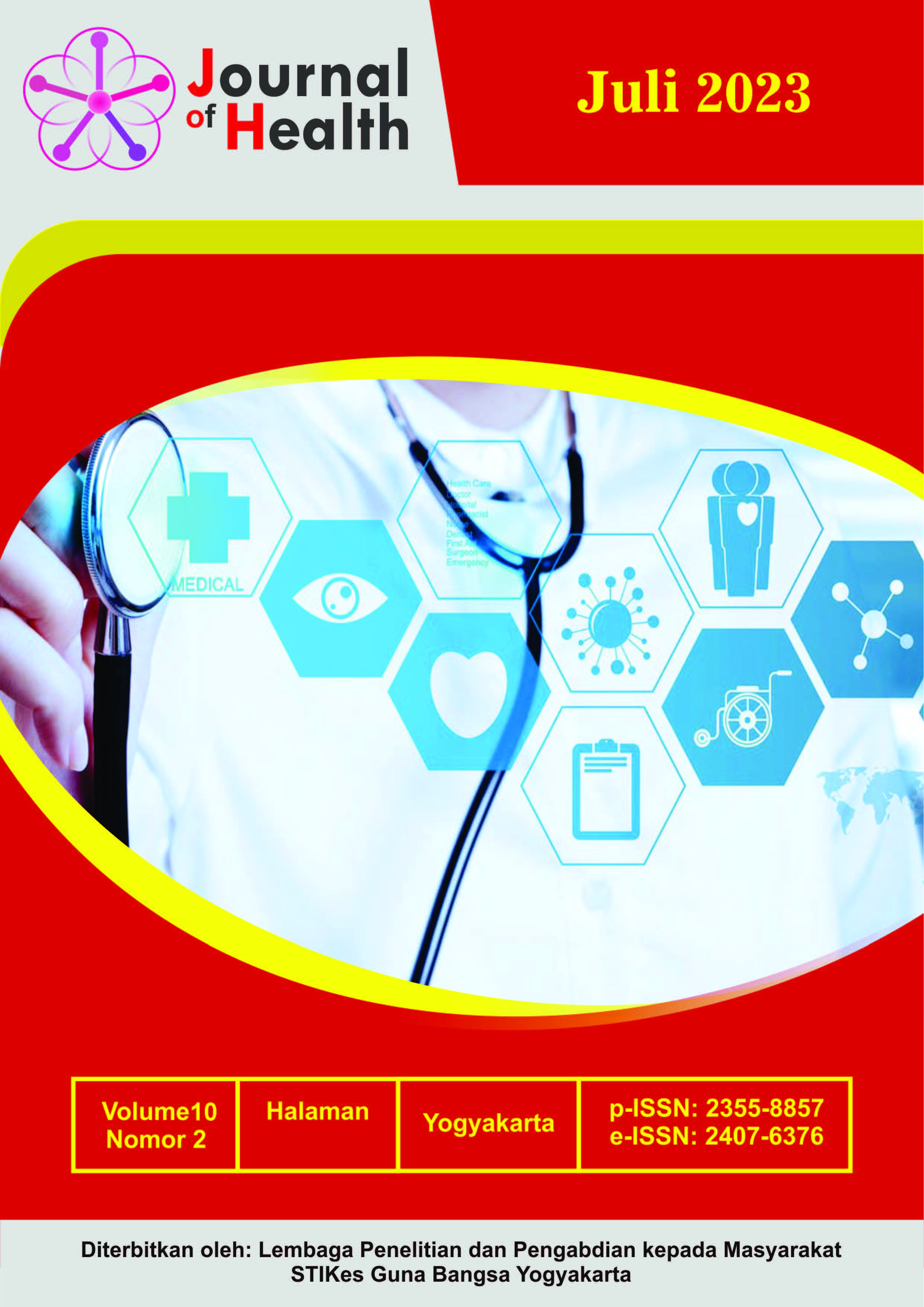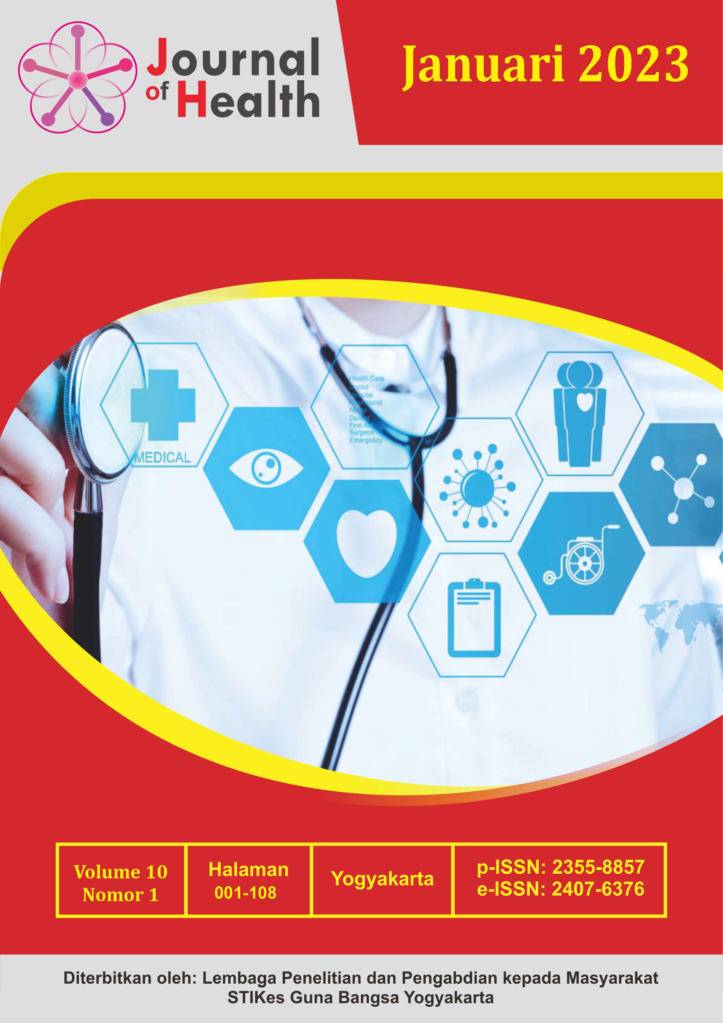 Vol. 10 No. 1 (2023)Praise and gratitude we pray to the presence of Allah Almighty, for the abundance of grace and gifts so that the Journal of Health (JoH) Vol.10 No.1 January, 2023 can be published on time. This volume consists of 12 articles with 39 authors from 9 universities/agencies in Indonesia, STIKES Surya Global Yogyakarta, Poltekkes Kemenkes Yogyakarta, Universitas Ahmad Dahlan Yogyakarta, Wijaya Husada, Politeknik Kesehatan Genesis Medicare, STIKES Guna Bangsa Yogyakarta, Universitas Sari Mulia, STIKES Bethesda Yakkum Yogyakarta, STIKes Madani Yogyakarta. The publication of this journal cannot be separated from the help of many parties, especially our gratitude to our review partners and the entire editorial team who have worked hard in reviewing the manuscript so that it deserves to be published in this journal. We also appreciate the researchers who have made the Journal of Health (JoH) a medium for publishing their research results.