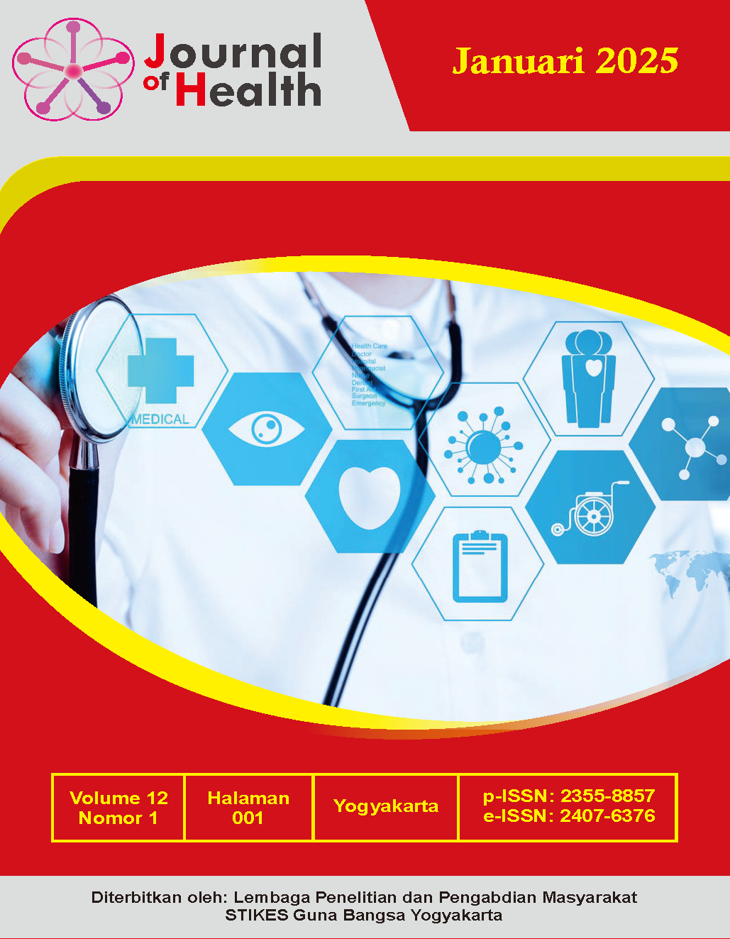 Vol. 12 No. 1 (2025)Praise and gratitude we offer to the presence of Allah SWT, for the abundance of grace and gifts so that the Journal of Health (JoH) Vol.12 No.1 January 2025 can be published on time. This volume consists of 15 articles with 53 authors from 9 universities/institutions in Indonesia, STIKES Guna Bangsa Yogyakarta, Sari Mulia University Banjarmasin, Jenderal Achmad Yani University Yogyakarta, Muhammadiyah University Ponorogo, 'Aisyiyah University Yogyakarta, Stikes Dharma Husada Bandung, Bandung State Polytechnic, Padjadjaran University, Atma Jaya Catholic University of Indonesia. The publication of this journal cannot be separated from the help of many parties, especially thanks to fellow reviewers and the entire editorial team who have worked hard in reviewing the manuscript so that it is worthy of being published in this journal. We also appreciate the researchers who have made the Journal of Health (JoH) a medium for publishing their research results. Finally, we hope that the articles in the Journal of Health (JoH) can add to the treasury of scientific knowledge and scientific insight, especially in the health sector. We really hope for constructive criticism and suggestions to improve this journal.